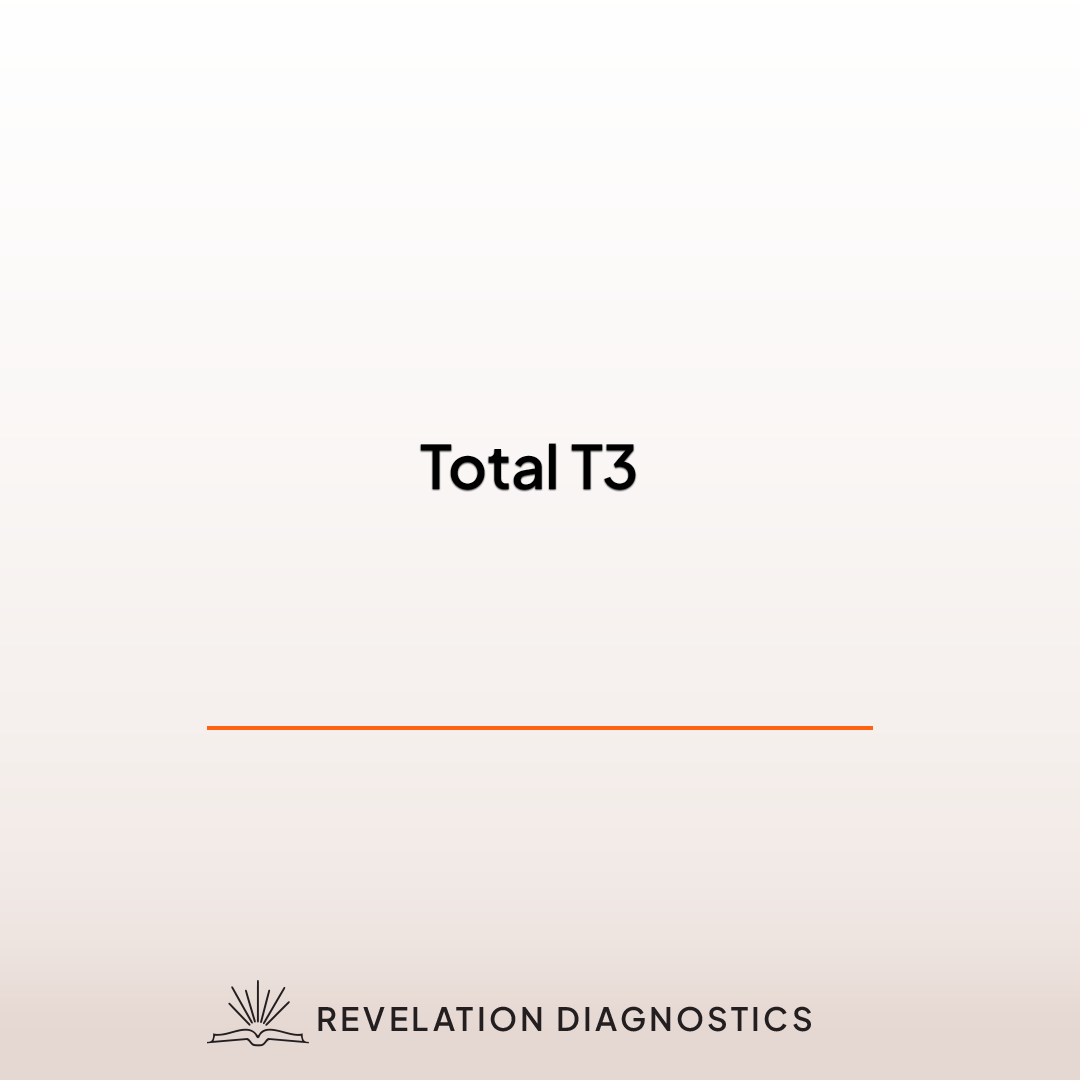 T3 is a thyroid hormone released in small amounts from the thyroid gland, but is primarily produced by other tissues from T4. This conversion process requires sufficient energy intake (especially carbohydrate), vitamin D, zinc and selenium, and is impaired by stress. T3 is the thyroid hormone primarily responsible for raising the metabolic rate. T3 is often carried in the bloodstream via binding proteins. The Total T3 metric is a measurement of the protein bound T3. High levels can indicate excessive supplementation, or hyperthyroidism. Low levels are suggestive of functional hypothyroidism.